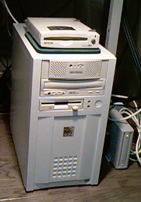 左が「SCSI BOY」の外観である。 上に乗っかっているのが、その後増設したSCSI接続のZIPドライブ、左に見えているのが、SCSI接続の増設ハードディスク(1.9ギガ)である。 結局、2ギガバイトの内蔵ハードディスクだけは足りないため、このようなことになったのだが、この外付けハードディスクにはWindows2000をインストールして、現在ダブルOSである。 写真でわかるように、スピーカーは内蔵している。物足りないといえば物足りないが思ったよりはいい音を出してくれている。 エンブレムは、「Windy Betty」の純正である。 で、実は、昨日(00,10,9)、20ギガ(Win上ではなぜか19.1ギガ)の内蔵IDEハードディスクと128メガのメモリを増設したので、現在のスペックは以下のとおりである。(増設・拡張編を書くほどではないか?) CPU セレロン433メガヘルツ(定格) メモリ 256メガ(ただし、8メガほど内蔵グラフィックチップと共有) HDD 2ギガ+4ギガ+19.1ギガ(以上内蔵)+1.9ギガ(外付け)=27ギガ グラフィックボード 「PC9821X−B03」(初代Milleniam相当) サウンド オンボード CDロムドライブ 36倍速 フロッピーディスクドライブ 2モード OS Windows2000、Windows98 現在メインマシーンとして活躍中。 (00/10/10記す) |